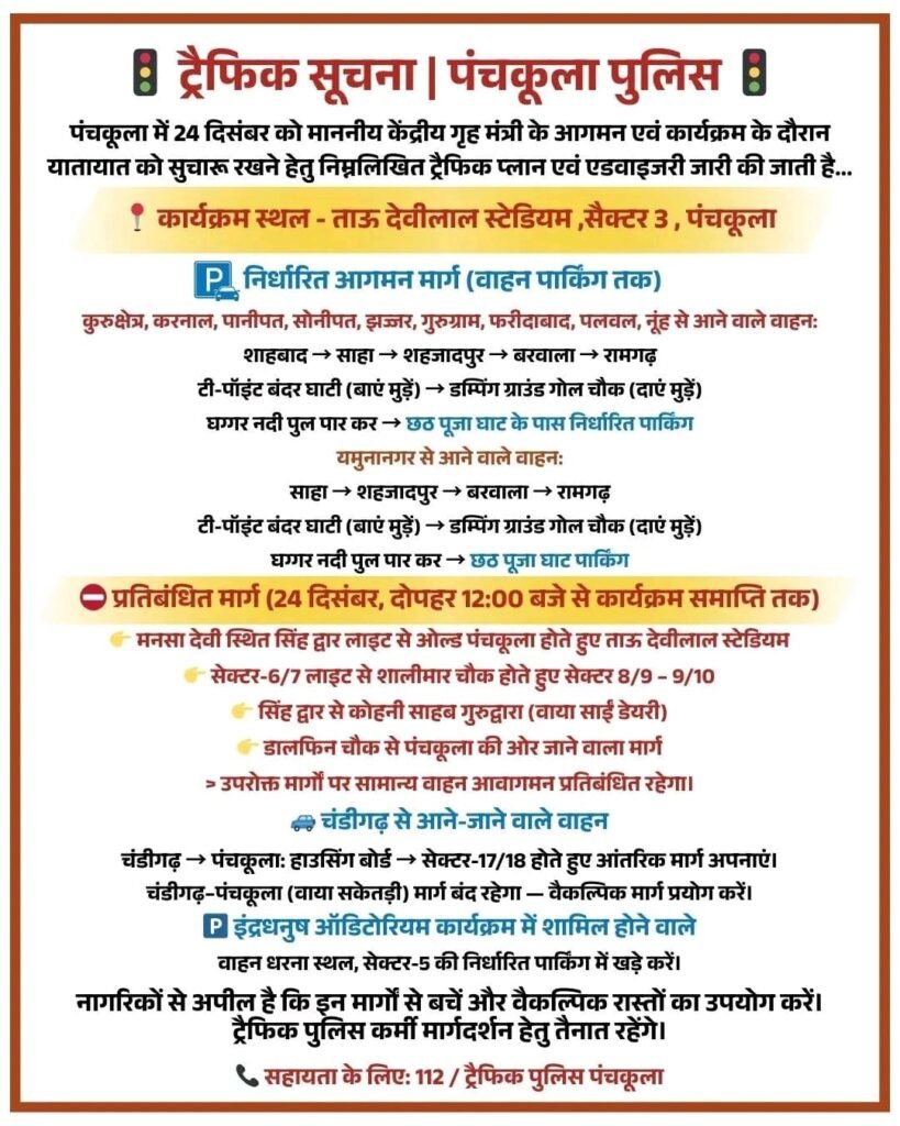 Traffic plan in Panchkula ahead of Amit Shah’s visit; 24 दिसंबर को केंद्रीय गृहमंत्री अमित शाह के पंचकूला आगमन के मद्देनज़र जिले में यातायात व्यवस्था को सुचारू बनाए रखने हेतु सभी आवश्यक तैयारियां पूर्ण कर ली गई हैं। यह जानकारी डीसीपी क्राइम एंड ट्रैफिक मनप्रीत सिंह सूदन ने दी। उन्होंने आम नागरिकों से सहयोग की अपील करते हुए निम्नलिखित यातायात परामर्श जारी किया है…