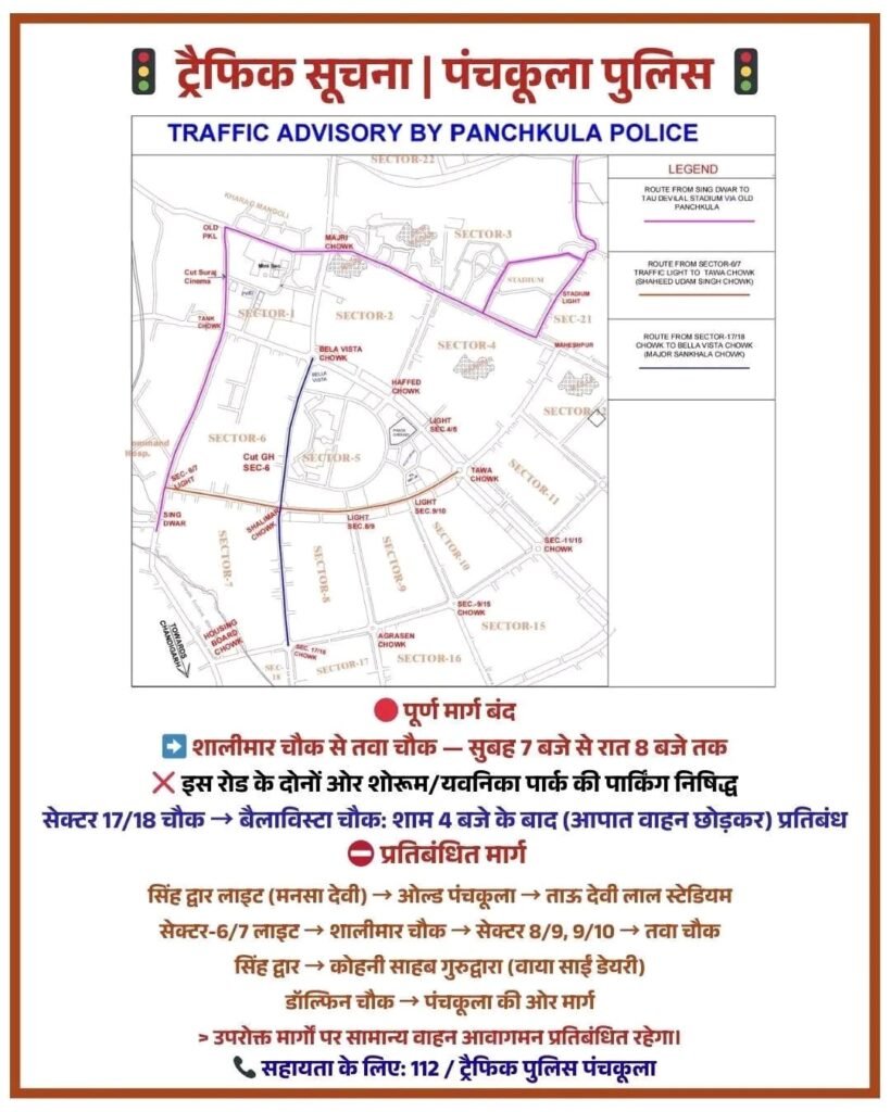 पंचकूला पुलिस नागरिकों से अपील करती है कि असुविधा से बचने के लिए निर्धारित रूट एवं पार्किंग स्थलों का ही उपयोग करें तथा यातायात पुलिस द्वारा जारी निर्देशों का पालन कर सहयोग प्रदान करें।