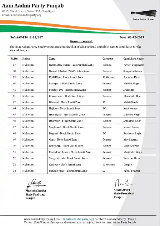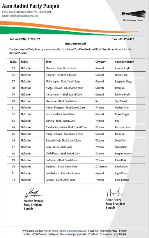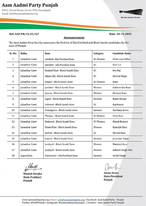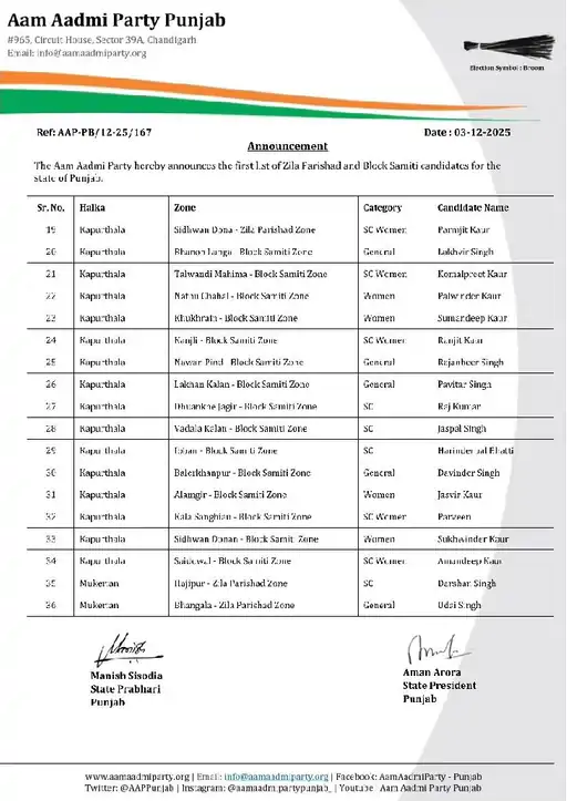 ‘ਆਪ’ ਵੱਲੋਂ ਉਮੀਦਵਾਰਾਂ ਦੀ ਪਹਿਲੀ ਸੂਚੀ ਜਾਰੀ, ਪਾਰਟੀ ਦੇ ਚੋਣ ਨਿਸ਼ਾਨ ‘ਤੇ ਲੜੇਗੀ ਸੰਮਤੀ ਜ਼ਿਲ੍ਹਾ ਪ੍ਰੀਸ਼ਦ ਚੋਣਾਂ