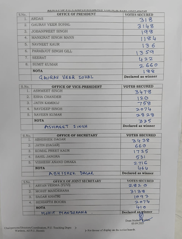 ਪੰਜਾਬ ਯੂਨੀਵਰਸਿਟੀ ਚੋਣਾਂ ‘ਚ ਪ੍ਰਧਾਨ ਦੇ ਅਹੁਦੇ ਲਈ 8 ਉਮੀਦਵਾਰ ਮੈਦਾਨ ਵਿੱਚ ਸਨ। ਗੌਰਵ ਵੀਰ ਸੋਹਲ ਨੂੰ 3148 ਵੋਟਾਂ, ਅਰਦਾਸ ਨੂੰ 318 ਵੋਟਾਂ, ਜੋਬਨਪ੍ਰੀਤ ਸਿੰਘ ਨੂੰ 198 ਵੋਟਾਂ, ਮਨਕੀਰਤ ਸਿੰਘ ਮਾਨ ਨੂੰ 1184 ਵੋਟਾਂ, ਨਵਨੀਤ ਕੌਰ ਨੂੰ 136 ਵੋਟਾਂ, ਪਰਬਜੋਤ ਸਿੰਘ ਗਿੱਲ ਨੂੰ 1359 ਵੋਟਾਂ, ਸੀਰਤ ਨੂੰ 422 ਵੋਟਾਂ ਅਤੇ ਸੁਮਿਤ ਕੁਮਾਰ ਨੂੰ 2660 ਵੋਟਾਂ ਮਿਲੀਆਂ। ਜਦੋਂ ਕਿ 188 ਲੋਕਾਂ ਨੇ ਨੋਟਾ ਦਬਾਇਆ।
