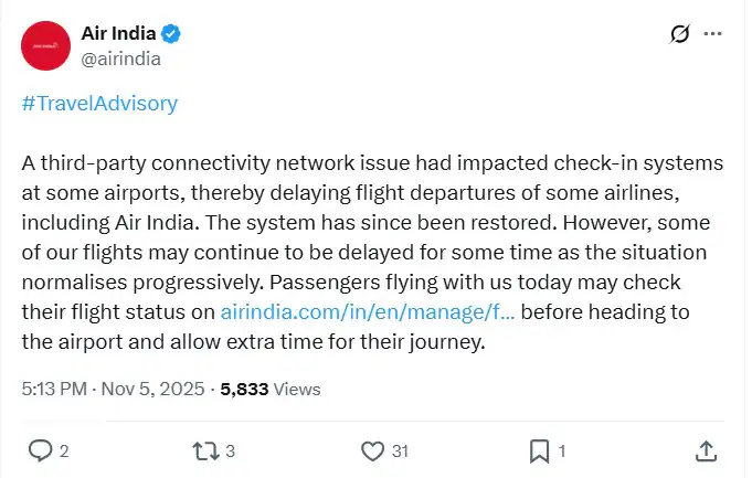 ਇਸ ਯਾਤਰੀ ਅਸੁਵਿਧਾ ਦੇ ਵਿਚਕਾਰ, ਏਅਰ ਇੰਡੀਆ ਨੇ ਇੱਕ ਯਾਤਰਾ ਲਈ ਦਿਸ਼ਾ-ਨਿਰਦੇਸ਼ ਜਾਰੀ ਕੀਤੇ, ਜਿਸ ਵਿੱਚ ਕਿਹਾ ਗਿਆ ਹੈ ਕਿ ਤੀਜੀ-ਧਿਰ ਕਨੈਕਟੀਵਿਟੀ ਸਮੱਸਿਆ ਨੇ ਕੁਝ ਹਵਾਈ ਅੱਡਿਆਂ ‘ਤੇ ਚੈੱਕ-ਇਨ ਸਿਸਟਮ ਨੂੰ ਪ੍ਰਭਾਵਿਤ ਕੀਤਾ, ਜਿਸ ਕਾਰਨ ਏਅਰ ਇੰਡੀਆ ਸਮੇਤ ਕੁਝ ਏਅਰਲਾਈਨਾਂ ਦੀਆਂ ਉਡਾਣਾਂ ਵਿੱਚ ਦੇਰੀ ਹੋਈ।
