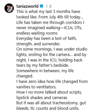 ਅਦਾਕਾਰਾ ਤਾਨੀਆ ਨੇ ਸੋਸ਼ਲ ਮੀਡੀਆ ‘ਤੇ ਇੱਕ ਭਾਵਨਾਤਮਕ ਪੋਸਟ ਸਾਂਝੀ ਕੀਤੀ, ਜਿਸ ਵਿੱਚ ਉਸਦੇ ਪਿਤਾ ‘ਤੇ ਹਮਲੇ ਤੋਂ ਬਾਅਦ ਤਿੰਨ ਮਹੀਨਿਆਂ ਦੇ ਚੁਣੌਤੀਪੂਰਨ ਅਤੇ ਭਾਵਨਾਤਮਕ ਸਫ਼ਰ ਦਾ ਵਰਣਨ ਕੀਤਾ ਗਿਆ। ਉਸਨੇ ਲਿਖਿਆ ਕਿ ਜ਼ਿੰਦਗੀ ਨੇ ਉਸਨੂੰ ਉਨ੍ਹਾਂ ਸਮਿਆਂ ਵਿੱਚੋਂ ਲੰਘਾਇਆ ਜਿਨ੍ਹਾਂ ਦੀ ਉਸਨੇ ਕਦੇ ਕਲਪਨਾ ਵੀ ਨਹੀਂ ਕੀਤੀ ਸੀ, ਜਿਵੇਂ ਕਿ ਆਈਸੀਯੂ, ਓਟੀ, ਅਤੇ ਵੇਟਿੰਗ ਰੂਮ।