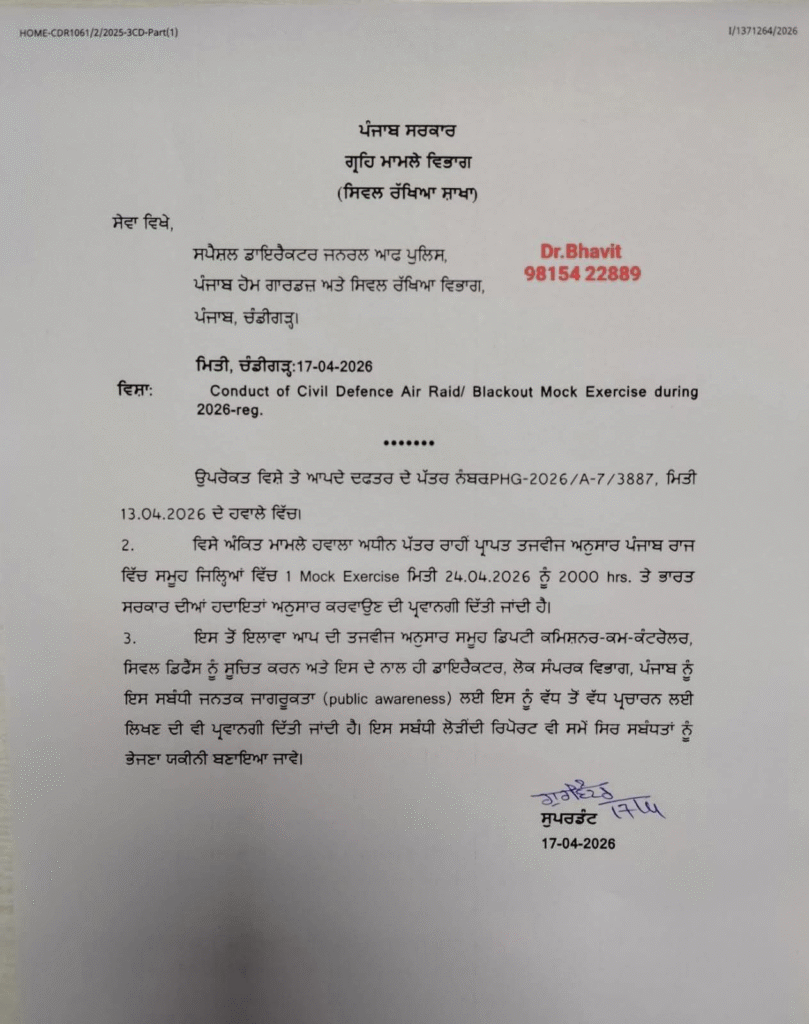 Punjab Mock Drill 2026: ਕੇਂਦਰੀ ਗ੍ਰਹਿ ਮੰਤਰਾਲੇ ਦੇ ਨਿਰਦੇਸ਼ਾਂ ਅਨੁਸਾਰ ਪੰਜਾਬ ਸਰਕਾਰ ਵੱਲੋਂ 24 ਅਪ੍ਰੈਲ ਨੂੰ ਸੂਬੇ ਦੇ ਸਾਰੇ ਜ਼ਿਲ੍ਹਿਆਂ ਵਿੱਚ ਇੱਕ ਵਿਸ਼ੇਸ਼ ‘ਮੌਕ ਡ੍ਰਿਲ’ (ਨਕਲੀ ਅਭਿਆਸ) ਕਰਵਾਈ ਜਾ ਰਹੀ ਹੈ। ਇਸ ਅਭਿਆਸ ਦਾ ਮੁੱਖ ਉਦੇਸ਼ ਜੰਗ ਵਰਗੀਆਂ ਐਮਰਜੈਂਸੀ ਸਥਿਤੀਆਂ ਦੌਰਾਨ ਸਿਵਲ ਡਿਫੈਂਸ ਅਤੇ ਸੁਰੱਖਿਆ ਏਜੰਸੀਆਂ ਦੀ ਤਿਆਰੀ ਦਾ ਮੁਲਾਂਕਣ ਕਰਨਾ ਹੈ। 15 ਮਿੰਟ ਦਾ […]