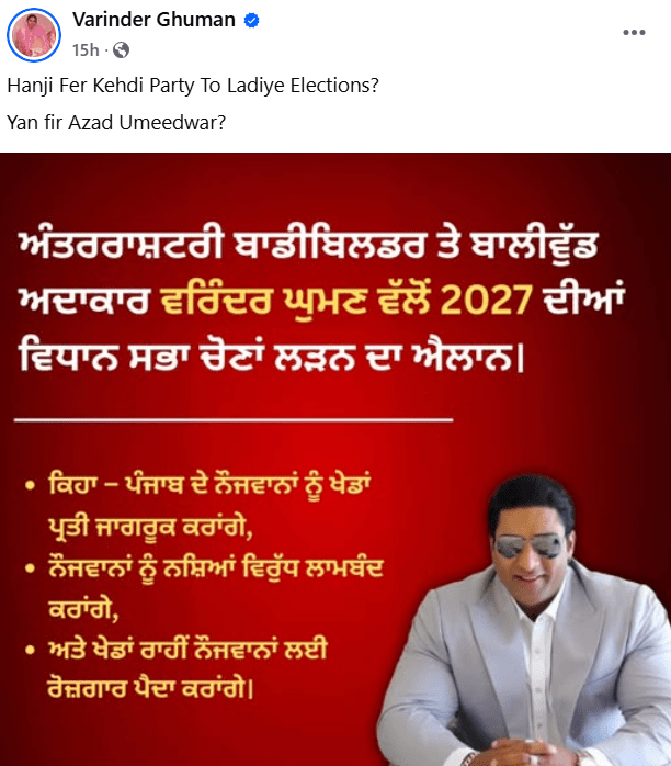 Punjab Assembly Elections 2027: ਘੁੰਮਣ ਨੇ ਆਪਣੇ ਫੈਨਸ ਨੂੰ ਪੁੱਛਿਆ ਕੀ ਉਨ੍ਹਾਂ ਨੂੰ 2027 ਵਿੱਚ ਕਿਸੇ ਪਾਰਟੀ ਵੱਲੋਂ ਚੋਣਾਂ ਲੜਨੀਆਂ ਚਾਹੀਦੀਆਂ ਹਨ ਜਾਂ ਆਜ਼ਾਦ ਉਮੀਦਵਾਰ ਵਜੋਂ। Varinder Ghuman announced to contest Punjab Assembly Elections 2027: ਦੇਸ਼ ਦੇ ਸਭ ਤੋਂ ਵੱਡੇ ਅੰਤਰਰਾਸ਼ਟਰੀ ਸ਼ਾਕਾਹਾਰੀ ਬਾਡੀ ਬਿਲਡਰ ਤੇ ਬਾਲੀਵੁੱਡ ਐਕਟਰ ਵਰਿੰਦਰ ਸਿੰਘ ਘੁੰਮਣ ਨੇ 2027 ‘ਚ ਪੰਜਾਬ ਵਿੱਚ […]