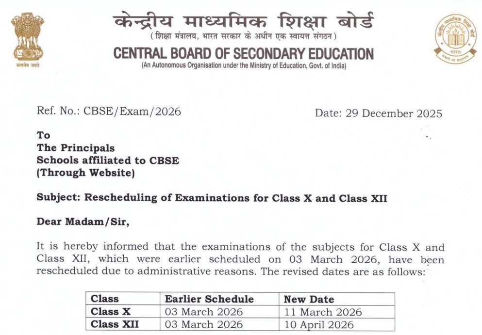 ਵਿਦਿਆਰਥੀਆਂ ਅਤੇ ਮਾਪਿਆਂ ਦੀ ਜਾਣਕਾਰੀ ਲਈ, ਦਸਵੀਂ ਜਮਾਤ ਦੀ ਪ੍ਰੀਖਿਆ, ਜੋ ਕਿ 3 ਮਾਰਚ ਨੂੰ ਨਿਰਧਾਰਤ ਸੀ, ਹੁਣ 11 ਮਾਰਚ, 2026 ਨੂੰ ਹੋਵੇਗੀ, ਜਦੋਂ ਕਿ ਬਾਰ੍ਹਵੀਂ ਜਮਾਤ ਦੀ ਪ੍ਰੀਖਿਆ, ਜੋ ਕਿ 3 ਮਾਰਚ ਨੂੰ ਨਿਰਧਾਰਤ ਸੀ, ਹੁਣ 10 ਅਪ੍ਰੈਲ, 2026 ਨੂੰ ਹੋਵੇਗੀ। ਇਹ ਧਿਆਨ ਦੇਣ ਯੋਗ ਹੈ ਕਿ 10ਵੀਂ ਤਿੱਬਤੀ; ਜਰਮਨ; ਨੈਸ਼ਨਲ ਕੈਡੇਟ ਕੋਰ; ਭੋਤੀ; ਲਿੰਬੂ; ਲੇਪਚਾ; ਕਰਨਾਟਕ ਸੰਗੀਤ (ਵੋਕਲ) ਦਾ ਪੇਪਰ ਹੋਣਾ ਤੈਅ ਸੀ, ਜਦੋਂ ਕਿ 12ਵੀਂ ਜਮਾਤ ਦਾ ਕਾਨੂੰਨੀ ਅਧਿਐਨ ਦਾ ਪੇਪਰ ਹੋਣਾ ਤੈਅ ਸੀ। ਹੋਰ ਪ੍ਰੀਖਿਆਵਾਂ ਪੁਰਾਣੀ ਡੇਟਸ਼ੀਟ ਅਨੁਸਾਰ ਹੀ ਹੋਣਗੀਆਂ, ਬਿਨਾਂ ਕਿਸੇ ਬਦਲਾਅ ਦੇ।