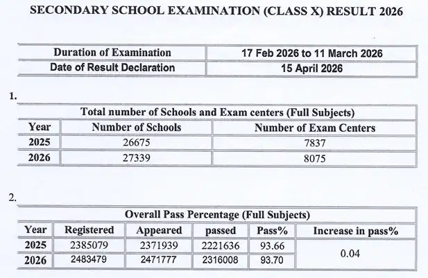 Central Board of Secondary Education (CBSE) ਨੇ 10ਵੀਂ ਜਮਾਤ ਦੇ ਬੋਰਡ ਨਤੀਜੇ ਐਲਾਨ ਦਿੱਤੇ ਹਨ। ਇਸ ਸਾਲ ਕੁੱਲ ਪਾਸ ਪ੍ਰਤੀਸ਼ਤਤਾ 93.70% ਦਰਜ ਕੀਤੀ ਗਈ ਹੈ, ਜੋ ਪਿਛਲੇ ਸਾਲ 2025 ਦੇ ਮੁਕਾਬਲੇ 0.04% ਵੱਧ ਹੈ।
