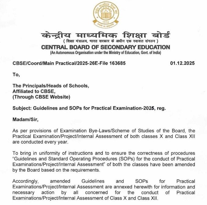 CBSE: ਕੇਂਦਰੀ ਸੈਕੰਡਰੀ ਸਿੱਖਿਆ ਬੋਰਡ (CBSE) ਨੇ 10ਵੀਂ ਅਤੇ 12ਵੀਂ ਜਮਾਤ ਦੇ ਵਿਦਿਆਰਥੀਆਂ ਲਈ ਪ੍ਰੈਕਟੀਕਲ ਪ੍ਰੀਖਿਆਵਾਂ, ਪ੍ਰੋਜੈਕਟਾਂ ਅਤੇ ਅੰਦਰੂਨੀ ਮੁਲਾਂਕਣਾਂ ਲਈ ਨਵੇਂ ਦਿਸ਼ਾ-ਨਿਰਦੇਸ਼ ਅਤੇ ਮਿਆਰੀ ਸੰਚਾਲਨ ਪ੍ਰਕਿਰਿਆਵਾਂ (SOPs) ਜਾਰੀ ਕੀਤੀਆਂ ਹਨ। ਪ੍ਰੈਕਟੀਕਲ ਅਤੇ ਅੰਦਰੂਨੀ ਮੁਲਾਂਕਣ ਬੋਰਡ ਦੇ ਪ੍ਰੀਖਿਆ ਉਪ-ਨਿਯਮਾਂ ਅਤੇ ਅਧਿਐਨ ਯੋਜਨਾ ਅਨੁਸਾਰ ਸਾਲਾਨਾ ਕੀਤੇ ਜਾਂਦੇ ਹਨ, ਪਰ ਇਸ ਸਾਲ ਹਦਾਇਤਾਂ ਅਤੇ ਪ੍ਰਕਿਰਿਆਵਾਂ ਵਿੱਚ ਇਕਸਾਰਤਾ ਬਣਾਈ ਰੱਖਣ ਲਈ ਕਈ ਮਹੱਤਵਪੂਰਨ ਬਦਲਾਅ ਕੀਤੇ ਗਏ ਹਨ।