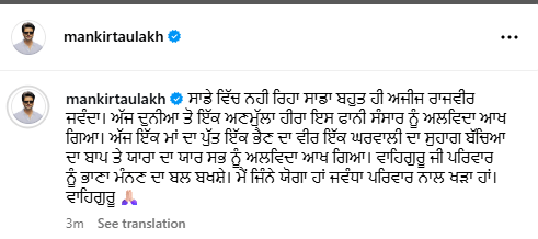Singer Mankirt Aulakh post- ਮਸ਼ਹੂਰ ਗਾਇਕ ਮਨਕਿਰਤ ਔਲਖ ਨੇ ਪੋਸਟ ‘ਚ ਭਾਵੁਕ ਹੋ ਲਿਖਿਆ ਕਿ ਅੱਜ ਦੁਨੀਆ ਤੋਂ ਅਣਮੁੱਲਾ ਹੀਰਾ ਇਸ ਫਾਨੀ ਸੰਸਾਰ ਨੂੰ ਅਲਵਿਦਾ ਆਖ ਗਿਆ…