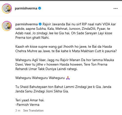 ਪੰਜਾਬੀ ਗਾਇਕ ਤੇ ਅਦਾਕਾਰ ਪਰਮੀਸ਼ ਵਰਮਾ ਨੇ ਬੜੇ ਦੁਖੀ ਮਨ ਨਾਲ ਰਾਜਵੀਰ ਜਵੰਦਾ ਦੇ ਮੌਤ ‘ਤੇ ਦੁੱਖ ਦਾ ਪ੍ਰਗਟਾਵਾ ਕੀਤਾ