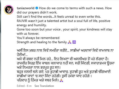 ਪੰਜਾਬੀ ਅਦਾਕਾਰ ਤਾਨੀਆ ਨੇ ਵੱਲੋਂ ਪੋਸਟ ਕਰ ਦੁੱਖ ਕੀਤਾ ਸਾਂਝਾ