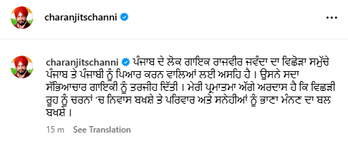 ਪੰਜਾਬ ਦੇ ਸਾਬਕਾ ਮੁੱਖ ਮੰਤਰੀ ਅਤੇ ਸੰਸਦ ਚਰਨਜੀਤ ਸਿੰਘ ਚੰਨੀ ਵੱਲੋਂ ਰਾਜਵੀਰ ਜਵੰਦਾ ਦੇ ਮੌਤ ‘ਤੇ ਪੋਸਟ ਕਰ ਦੁੱਖ ਕੀਤਾ ਸਾਂਝਾ