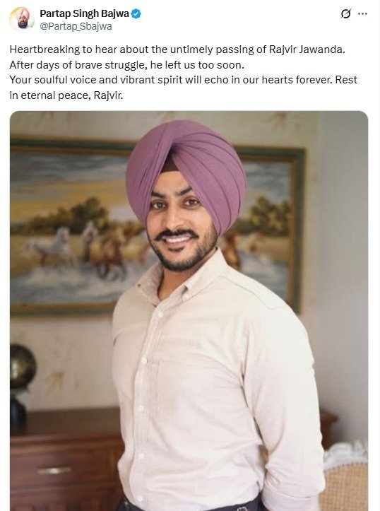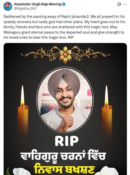 Raja Warring Post; ਕਾਂਗਰਸ ਪ੍ਰਧਾਨ ਰਾਜਾ ਵੜਿੰਗ ਨੇ ਰਾਜਵੀਰ ਜਵੰਦਾ ਦੀ ਮੌਤ ‘ਤੇ ਪੋਸਟ ਸਾਂਝੀ ਕਰ ਦੁੱਖ ਦਾ ਪ੍ਰਗਟਾਵਾ ਕੀਤਾ