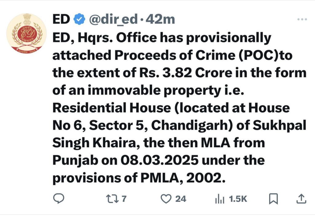 ED action on Sukhpal Khaira: ਪੰਜਾਬ ਕਾਂਗਰਸ ਦੇ ਵਿਧਾਇਕ ਸੁਖਪਾਲ ਸਿੰਘ ਖਹਿਰਾ ਖਿਲਾਫ ਇਨਫੋਰਸਮੈਂਟ ਡਾਇਰੈਕਟੋਰੇਟ (ED) ਨੇ ਵੱਡੀ ਕਾਰਵਾਈ ਕੀਤੀ ਹੈ। ਈਡੀ ਨੇ ਖਹਿਰਾ ਦੀ ਅਚੱਲ ਜਾਇਦਾਦ ਯਾਨੀ ਉਨ੍ਹਾਂ ਦਾ ਚੰਡੀਗੜ੍ਹ ਸਥਿਤ ਘਰ ਕੁਰਕ ਕਰ ਲਿਆ ਹੈ। ਉਨ੍ਹਾਂ ਦਾ ਘਰ ਸੈਕਟਰ-5, ਚੰਡੀਗੜ੍ਹ ਵਿੱਚ ਸਥਿਤ ਹੈ। ਜਿਸ ਦੀ ਕੀਮਤ 3.82 ਕਰੋੜ ਰੁਪਏ ਹੈ।