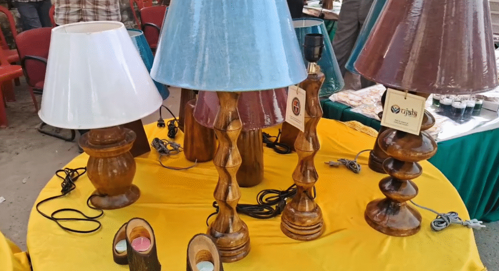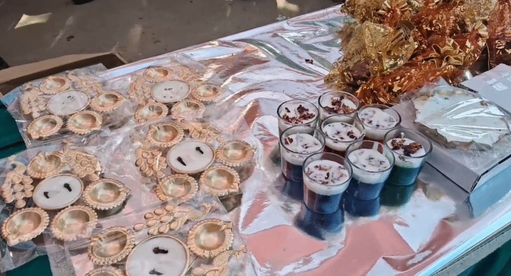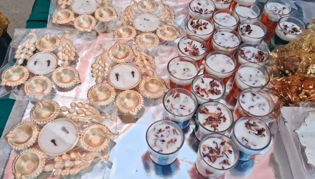 ਗੁੜ ਦੇ ਸਕਰਪਾਰੇ ਅਤੇ ਹੋਰ ਕਾਫੀ ਕਿਸਮ ਦੀ ਭਾਜੀ, ਮੋਮ ਦੇ ਦੀਵੇ, ਖੁਸ਼ਬੂਦਾਰ ਕੱਚ ਦੇ ਦੀਵੇ, ਸੁੰਦਰ ਸਜਾਵਟ ਵਾਲੇ ਦੀਵੇ ਅਤੇ ਕਈ ਤਰਾਂ ਦੇ ਲੱਕੜ ਦੇ ਟੇਬਲ ਲੈਂਪ ਵੇਣ ਲਈ ਰੱਖੇ ਗਏ ਹਨ। ਲੋਕਾਂ ਵੱਲੋਂ ਇਹਨਾਂ ਚੀਜਾਂ ਵਿਚ ਕਾਫੀ ਦਿਲਚਸਪੀ ਵਿਖਾਈ ਜਾ ਰਹੀ ਹੈ। ਇਹਨਾਂ ਨੂੰ ਖ੍ਰੀਦਿਆ ਜਾ ਰਿਹਾ।