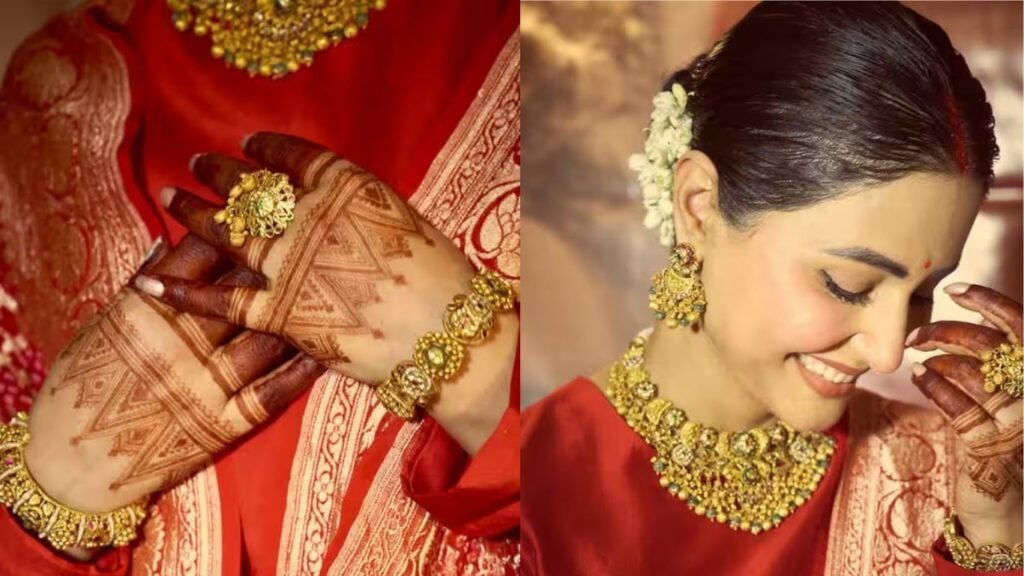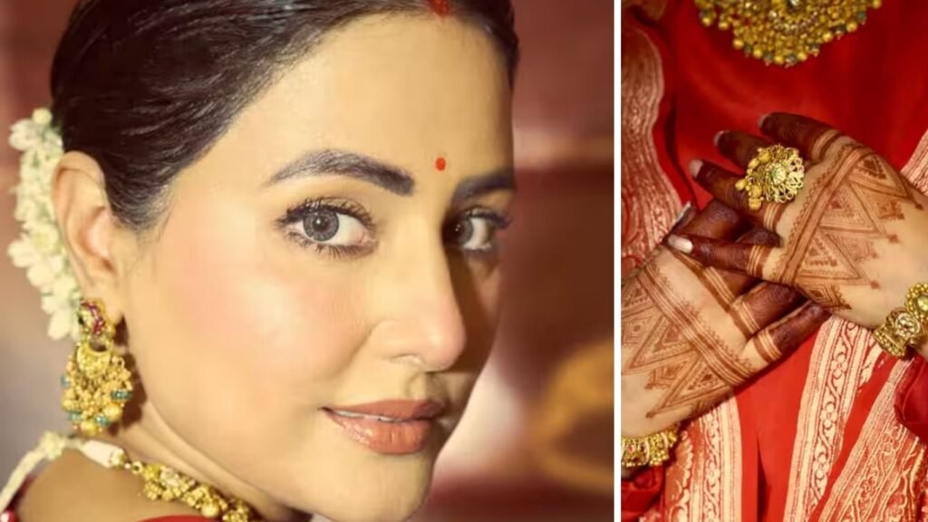 ਹਿਨਾ ਖਾਨ ਨੇ ਖਾਸ ਦਿਨ ਲਈ ਭਾਰੀ ਗਹਿਣੇ ਪਾਏ। ਹਾਰ ਅਤੇ ਸੋਨੇ ਦੀਆਂ ਵਾਲੀਆਂ ਪਹਿਨ ਕੇ, ਹਿਨਾ ਖਾਨ ਇੱਕ ਨਵ-ਵਿਆਹੀ ਦੁਲਹਨ ਵਾਂਗ ਲੱਗ ਰਹੀ ਸੀ।