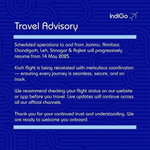 Indigo Travel Advisory;ਇੰਡੀਗੋ 14 ਮਈ ਤੋਂ ਅੰਮ੍ਰਿਤਸਰ ਹਵਾਈ ਅੱਡੇ ਤੋਂ ਸੇਵਾਵਾਂ ਸ਼ੁਰੂ ਕਰ ਰਹੀ ਹੈ। ਇੰਡੀਗੋ ਦੇ ਅਨੁਸਾਰ, ਅੰਮ੍ਰਿਤਸਰ ਅਤੇ ਚੰਡੀਗੜ੍ਹ ਤੋਂ ਇਲਾਵਾ, ਇੰਡੀਗੋ ਲੇਹ, ਸ਼੍ਰੀਨਗਰ, ਜੰਮੂ ਅਤੇ ਰਾਜਕੋਟ ਲਈ ਵੀ ਆਪਣੀਆਂ ਉਡਾਣਾਂ ਸ਼ੁਰੂ ਕਰੇਗੀ।