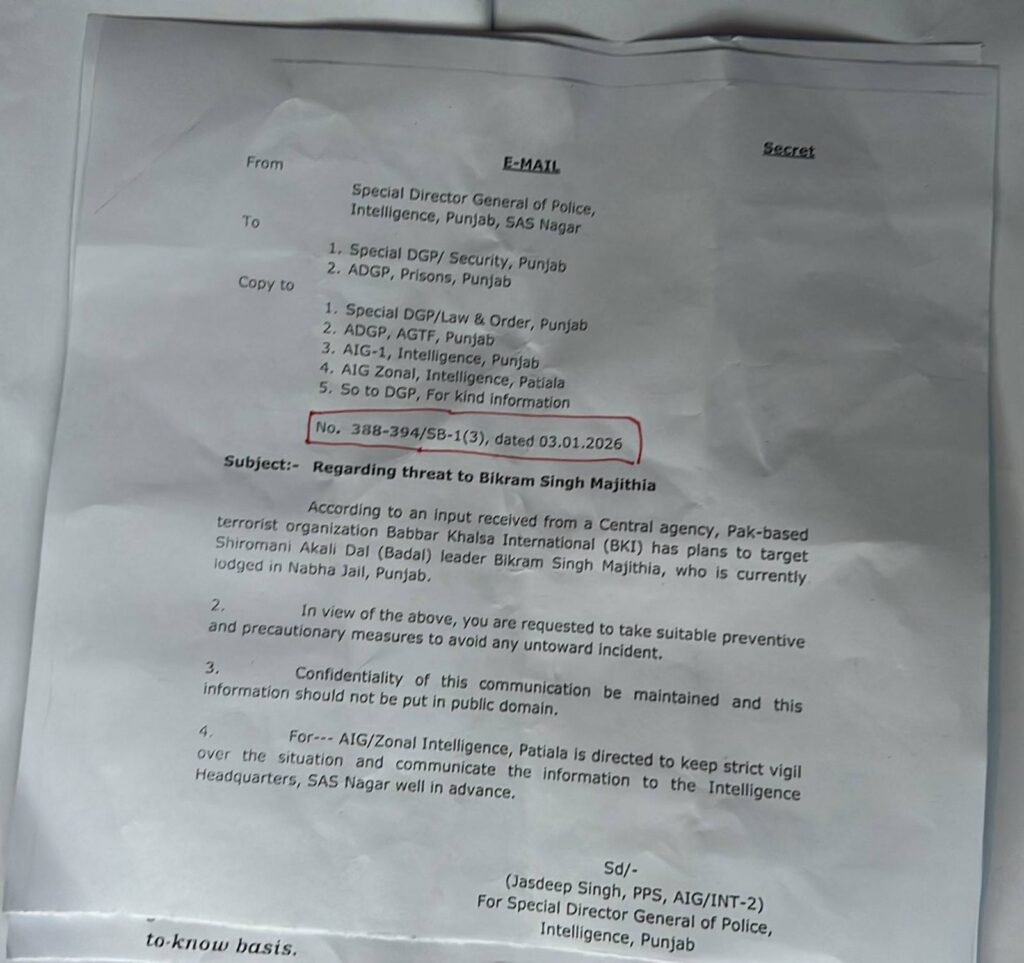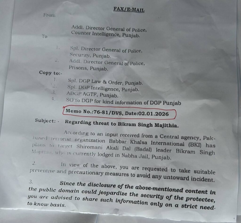 Breaking News: ਜੇਲ੍ਹ ਵਿੱਚ ਬੰਦ ਬਿਕਰਮ ਮਜੀਠੀਆ ਦੀ ਜਾਨ ਨੂੰ ਖ਼ਤਰਾ,ਬੱਬਰ ਖਾਲਸਾ ਤੋਂ ਬਿਕਰਮ ਸਿੰਘ ਮਜੀਠੀਆ ਦੀ ਜਾਨ ਨੂੰ ਖ਼ਤਰਾ ਸਪੈਸ਼ਲ ਡੀਜੀਪੀ ਇੰਟੈਲੀਜੈਂਸ ਨੇ ਸਪੈਸ਼ਲ ਡੀਜੀਪੀ ਸਿਕਿਉਰਟੀ ਨੂੰ ਅਤੇ ਡੀਜੀਪੀ ਪ੍ਰਜਨ ਨੂੰ ਲਿਖਿਆ ਪੱਤਰ,2 ਜਨਵਰੀ 2026 ਨੂੰ ਸਪੈਸ਼ਲ ਡੀਜੀਪੀ ਇੰਟੈਲੀਜੈਂਸ ਵੱਲੋਂ ਲਿਖਿਆ ਗਿਆ ਪੱਤਰ