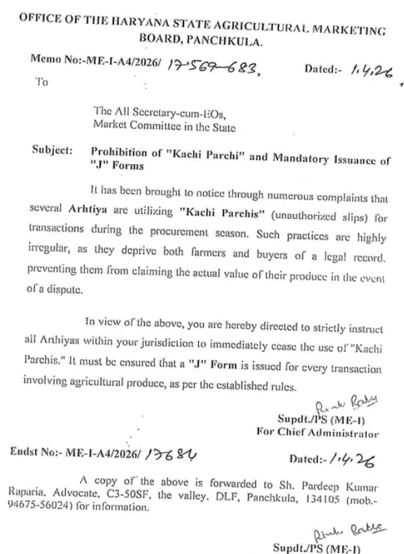 ਸਰਕਾਰ ਦੁਆਰਾ ਜਾਰੀ ਕੀਤੇ ਗਏ ਹੁਕਮ ਵਿੱਚ ਸਪੱਸ਼ਟ ਤੌਰ ‘ਤੇ ਸਪੱਸ਼ਟ ਕੀਤਾ ਗਿਆ ਹੈ ਕਿ ਕੋਈ ਵੀ ਆੜ੍ਹਤੀ (ਕਮਿਸ਼ਨ ਏਜੰਟ) ਕਿਸੇ ਕਿਸਾਨ ਨੂੰ ‘ਕੱਚੀ ਪਰਚੀ’ (ਗੈਰ ਰਸਮੀ ਪਰਚੀ) ਜਾਰੀ ਨਹੀਂ ਕਰੇਗਾ। ਇਸ ਦੀ ਬਜਾਏ, ਫਸਲਾਂ ਦੀ ਖਰੀਦ ਤੋਂ ਬਾਅਦ, ਲੈਣ-ਦੇਣ ਵਿੱਚ ਪਾਰਦਰਸ਼ਤਾ ਨੂੰ ਯਕੀਨੀ ਬਣਾਉਣ ਲਈ ਕਿਸਾਨ ਨੂੰ ਇੱਕ ‘ਜੇ-ਫਾਰਮ’ ਲਾਜ਼ਮੀ ਤੌਰ ‘ਤੇ ਜਾਰੀ ਕੀਤਾ ਜਾਣਾ ਚਾਹੀਦਾ ਹੈ।