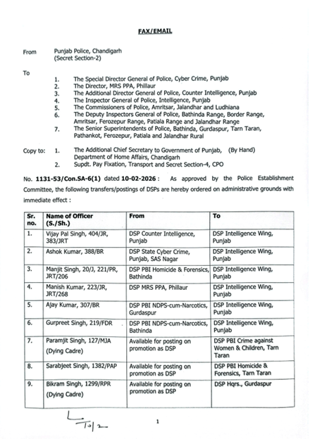 Punjab Police Transfer Order; ਪੰਜਾਬ ਸਰਕਾਰ ਵੱਲੋਂ ਪੁਲਿਸ ਪ੍ਰਸ਼ਾਸਨ ਵਿੱਚ ਵੱਡਾ ਫੇਰਬਦਲ ਕਰਦਿਆਂ 12 ਡਿਪਟੀ ਸੁਪਰਿੰਟੈਂਡੈਂਟ ਆਫ ਪੁਲਿਸ (DSP) ਦੇ ਤਬਾਦਲੇ ਕੀਤੇ ਗਏ ਹਨ। ਇਸ ਦੇ ਨਾਲ ਹੀ 6 ਡੀਐਸਪੀ ਨੂੰ ਡੀਐਸਪੀ ਇੰਟੈਲੀਜੈਂਸ ਵਿੰਗ ਦਾ ਅਹਿਮ ਚਾਰਜ ਸੌਂਪਿਆ ਗਿਆ ਹੈ।