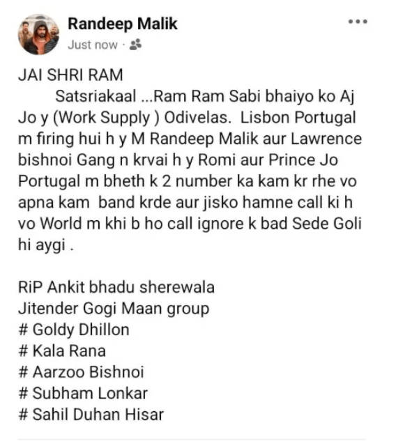 ਲਾਰੈਂਸ ਗੈਂਗ ਨਾਲ ਜੁੜੇ ਰਣਦੀਪ ਮਲਿਕ ਨੇ ਸੋਸ਼ਲ ਮੀਡੀਆ ‘ਤੇ ਪੋਸਟ ਕਰਕੇ ਦਾਅਵਾ ਕੀਤਾ ਕਿ ਪੁਰਤਗਾਲ ਦੇ ਲਿਸਬਨ ਵਿੱਚ ਹੋਈ ਗੋਲੀਬਾਰੀ ਮੈਂ, ਰਣਦੀਪ ਮਲਿਕ ਅਤੇ ਲਾਰੈਂਸ ਬਿਸ਼ਨੋਈ ਗੈਂਗ ਨੇ ਕੀਤੀ ਸੀ। ਇਹ ਰੋਮੀ ਅਤੇ ਪ੍ਰਿੰਸ, ਜੋ ਪੁਰਤਗਾਲ ਵਿੱਚ ਬੈਠ ਕੇ ਗੈਰ-ਕਾਨੂੰਨੀ ਕੰਮ ਕਰ ਰਹੇ ਹਨ, ਨੂੰ ਆਪਣਾ ਕੰਮ ਬੰਦ ਕਰ ਦੇਣਾ ਚਾਹੀਦਾ ਹੈ। ਉਸਨੇ ਅੱਗੇ ਲਿਖਿਆ, “ਅਤੇ ਜਿਸ ਵਿਅਕਤੀ ਨੂੰ ਅਸੀਂ ਬੁਲਾਇਆ ਹੈ, ਉਹ ਦੁਨੀਆ ਵਿੱਚ ਕਿਤੇ ਵੀ ਹੋਵੇ, ਜੇਕਰ ਉਹ ਬੁਲਾਵੇ ਨੂੰ ਅਣਦੇਖਾ ਕਰਦਾ ਹੈ, ਤਾਂ ਉਸਨੂੰ ਸਿੱਧੀ ਗੋਲੀ ਮਾਰ ਦਿੱਤੀ ਜਾਵੇਗੀ।” ਇਸ ਤੋਂ ਪਹਿਲਾਂ ਵੀ ਕੈਨੇਡਾ, ਅਮਰੀਕਾ ਅਤੇ ਅਜ਼ਰਬਾਈਜਾਨ ਵਿੱਚ ਗੈਂਗਸਟਰਾਂ ਵਿਚਕਾਰ ਗੈਂਗਵਾਰ ਦੇ ਮਾਮਲੇ ਸਾਹਮਣੇ ਆ ਚੁੱਕੇ ਹਨ।
