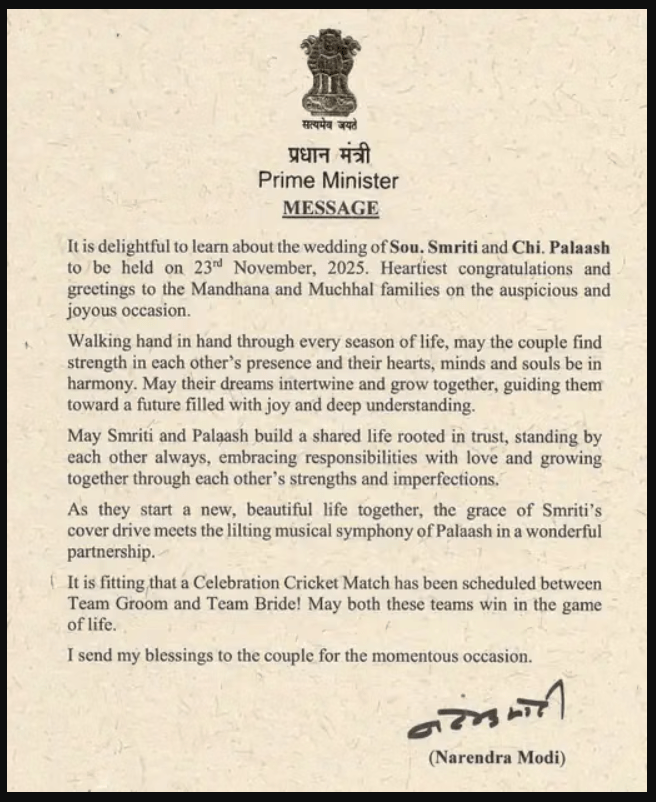 पीएम मोदी के इसी पत्र से स्मृति और पलाश की शादी की तारीख, 23 नवंबर, भी सार्वजनिक हुई है, जिसे कपल ने अब तक गोपनीय रखा था। स्मृति मंधाना के लिए यह दौर उनके करियर के शिखर पर आया है, जब उन्होंने हाल ही में भारतीय महिला टीम को पहली आईसीसी महिला वनडे वर्ल्ड कप जीत दिलाने में महत्वपूर्ण भूमिका निभाई है।
