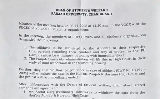 ਅੱਜ ਇਸ ‘ਤੇ ਦਸਤਖਤ ਕਰਨ ਤੋਂ ਬਾਅਦ, ਯੂਨੀਵਰਸਿਟੀ ਇੰਸਟੀਚਿਊਟ ਆਫ਼ ਲੀਗਲ ਸਟੱਡੀਜ਼ ਦੇ ਵਿਦਿਆਰਥੀ ਅਤੇ ਆਗੂ ਅਭਿਸ਼ੇਕ ਡਾਗਰ ਨੇ ਆਪਣਾ ਮਰਨ ਵਰਤ ਖਤਮ ਕਰ ਦਿੱਤਾ ਹੈ। ਕੇਂਦਰ ਸਰਕਾਰ ਦੁਆਰਾ ਸੈਨੇਟ ਅਤੇ ਸਿੰਡੀਕੇਟ ਭੰਗ ਕਰਨ ਵਿਰੁੱਧ ਚੱਲ ਰਿਹਾ ਸੰਘਰਸ਼ ਜਾਰੀ ਰਹੇਗਾ।