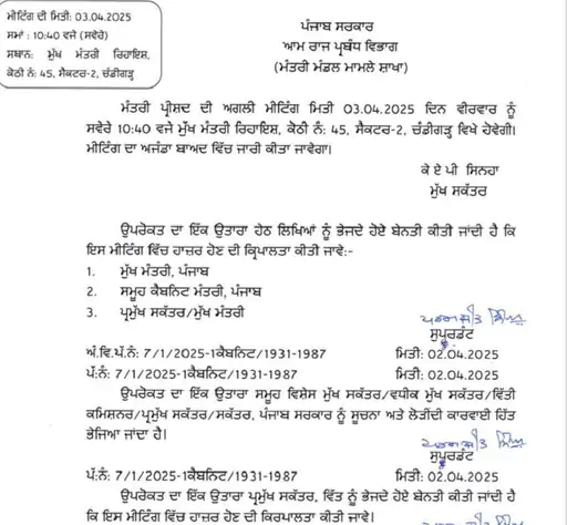 Punjab ; ਪੰਜਾਬ ਦੇ ਲੋਕਾਂ ਲਈ ਅੱਜ ਵੱਡਾ ਐਲਾਨ ਹੋ ਸਕਦਾ ਹੈ। ਦਰਅਸਲ, ਪੰਜਾਬ ਮੰਤਰੀ ਮੰਡਲ ਦੀ ਅਹਿਮ ਮੀਟਿੰਗ 3 ਅਪ੍ਰੈਲ ਨੂੰ ਹੋਣ ਜਾ ਰਹੀ ਹੈ। ਇਹ ਮੀਟਿੰਗ ਮੁੱਖ ਮੰਤਰੀ ਭਗਵੰਤ ਮਾਨ ਦੀ ਚੰਡੀਗੜ੍ਹ ਸਥਿਤ ਰਿਹਾਇਸ਼ ‘ਤੇ ਸਵੇਰੇ 10.40 ਵਜੇ ਹੋਵੇਗੀ।