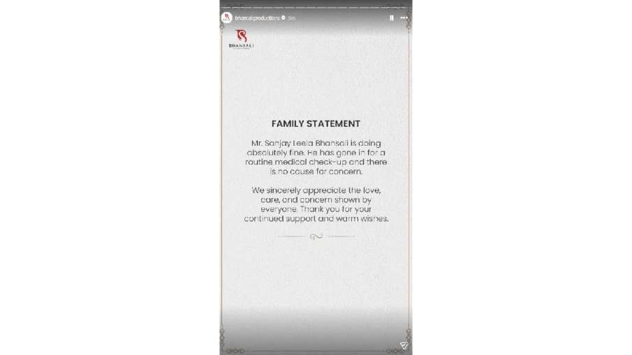 ਸੰਜੇ ਲੀਲਾ ਭੰਸਾਲੀ ਦੀ ਟੀਮ ਨੇ ਇੱਕ ਬਿਆਨ ਜਾਰੀ ਕਰਕੇ ਕਿਹਾ, “ਸੰਜੇ ਲੀਲਾ ਭੰਸਾਲੀ ਦੇ ਹਸਪਤਾਲ ਵਿੱਚ ਭਰਤੀ ਹੋਣ ਦੀਆਂ ਰਿਪੋਰਟਾਂ ਪੂਰੀ ਤਰ੍ਹਾਂ ਝੂਠੀਆਂ ਅਤੇ ਬੇਬੁਨਿਆਦ ਹਨ। ਉਨ੍ਹਾਂ ਵਿੱਚ ਕੋਈ ਸੱਚਾਈ ਨਹੀਂ ਹੈ। ਅਸੀਂ ਤੁਹਾਨੂੰ ਬੇਨਤੀ ਕਰਦੇ ਹਾਂ ਕਿ ਅਜਿਹੀਆਂ ਕਿਸੇ ਵੀ ਖ਼ਬਰ ‘ਤੇ ਭਰੋਸਾ ਨਾ ਕਰੋ, ਕਿਉਂਕਿ ਉਨ੍ਹਾਂ ਕੋਲ ਕੋਈ ਪ੍ਰਮਾਣਿਤ ਸਰੋਤ ਨਹੀਂ ਹੈ।” ਇਹ ਪੁਸ਼ਟੀ ਕਰਦਾ ਹੈ ਕਿ ਫਿਲਮ ਨਿਰਮਾਤਾ ਪੂਰੀ ਤਰ੍ਹਾਂ ਸਿਹਤਮੰਦ ਹੈ।