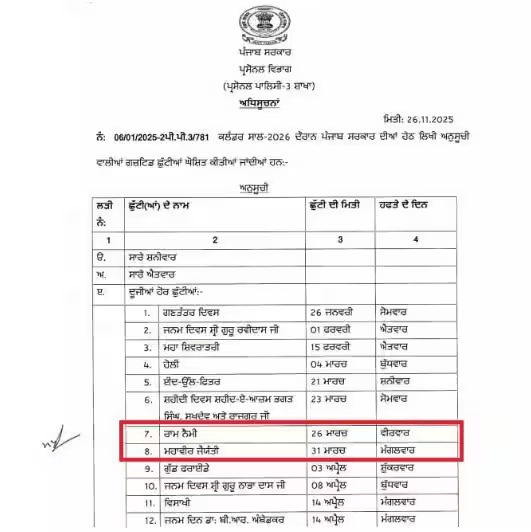 ਪੰਜਾਬ ਵਿੱਚ ਵੀਰਵਾਰ ਨੂੰ ਸਰਕਾਰੀ ਛੁੱਟੀ, 26 ਮਾਰਚ ਨੂੰ ਰਾਮ ਨੌਮੀ ਜਾਵੇਗੀ ਮਨਾਈ