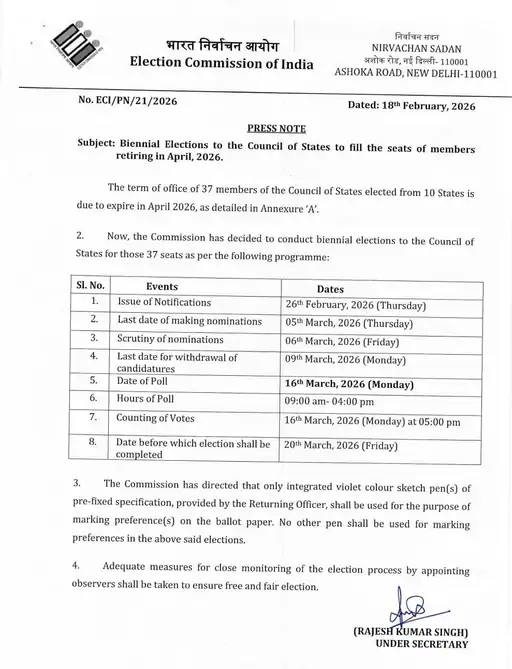 बुधवार को भारत निर्वाचन आयोग (ECI) की ओर से 10 राज्यों की 37 राज्यसभा सीटों को लेकर नोटिफिकेशन जारी किया गया। 16 मार्च को वोटिंग के बाद शाम को रिजल्ट जारी होगा।